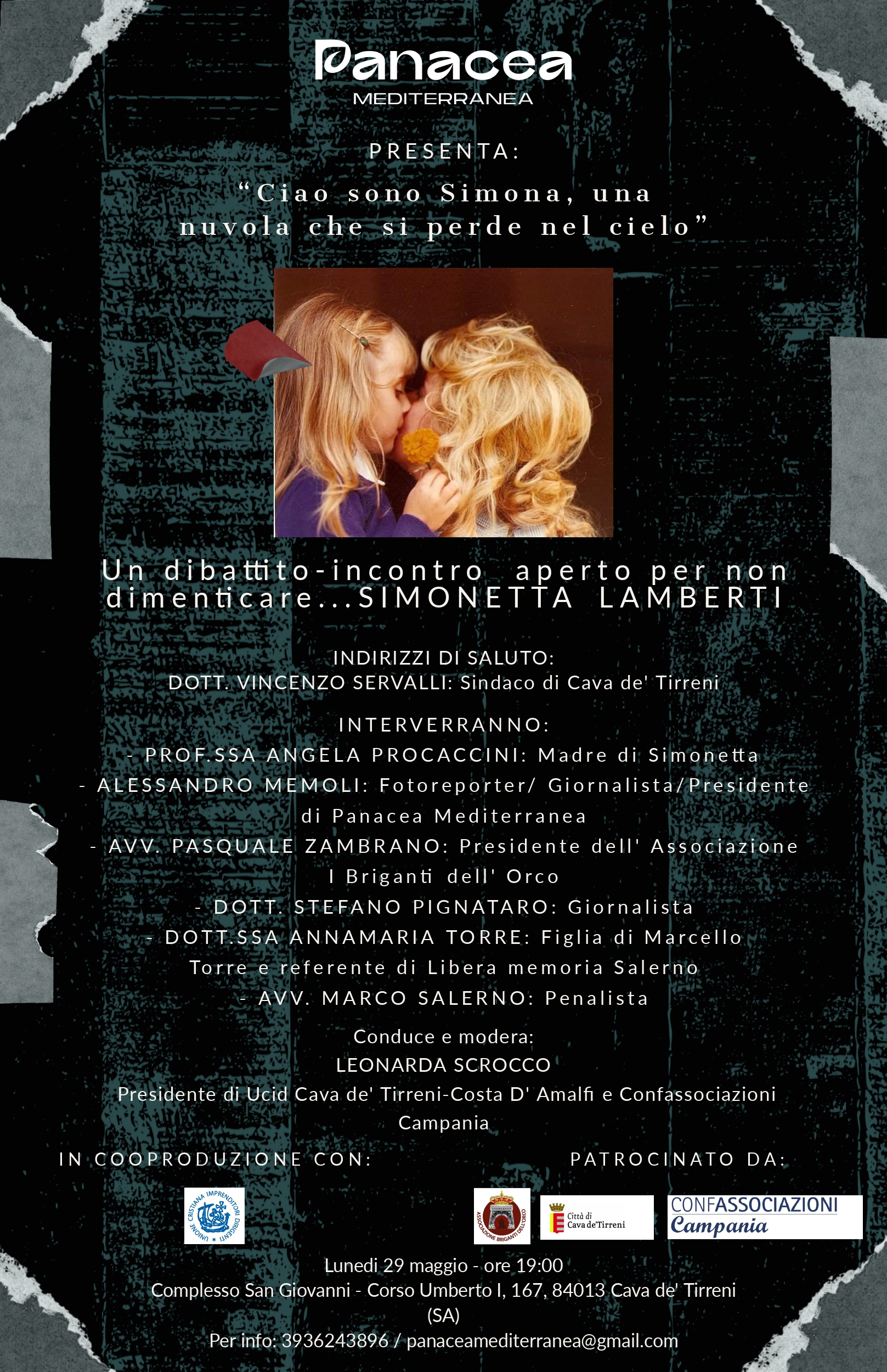 Lunedi 29 maggio, alle ore 19:00, presso il Complesso San Giovanni – Corso Umberto I, 167, 84013 Cava de’ Tirreni (SA) si terrà un dibattito-incontro aperto per non dimenticare Simonetta Lamberti.
