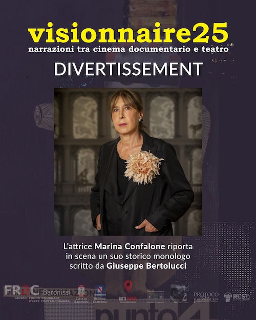 Si conclude con il suo sesto e attesissimo appuntamento venerdì 19 settembre la quinta edizione di Visionnaire – Narrazioni tra cinema documentario e teatro, la rassegna curata dall’attore e regista Andrea Avagliano che quest’anno ha esplorato il tema del “Divertissement” attraverso la poliedrica e ricchissima espressività artistica napoletana. Protagonista l’attrice Marina Confalone in un monologo scritto da Giuseppe Bertolucci.