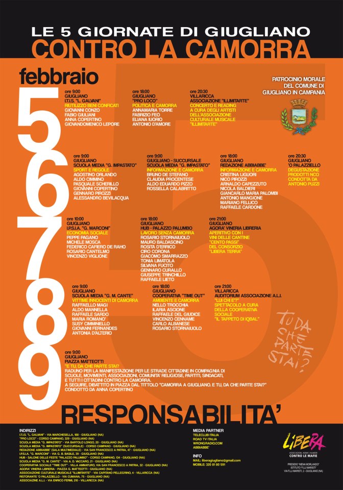 Dal 5 al 9 febbraio 2013: cittadini, associazioni, movimenti, sindacati, scuole.. tutti uniti, per riflettere sul rapporto tra camorra e territorio. “E’ il Noi, che vince!” – come sostiene Don Luigi Ciotti, fondatore di Libera.