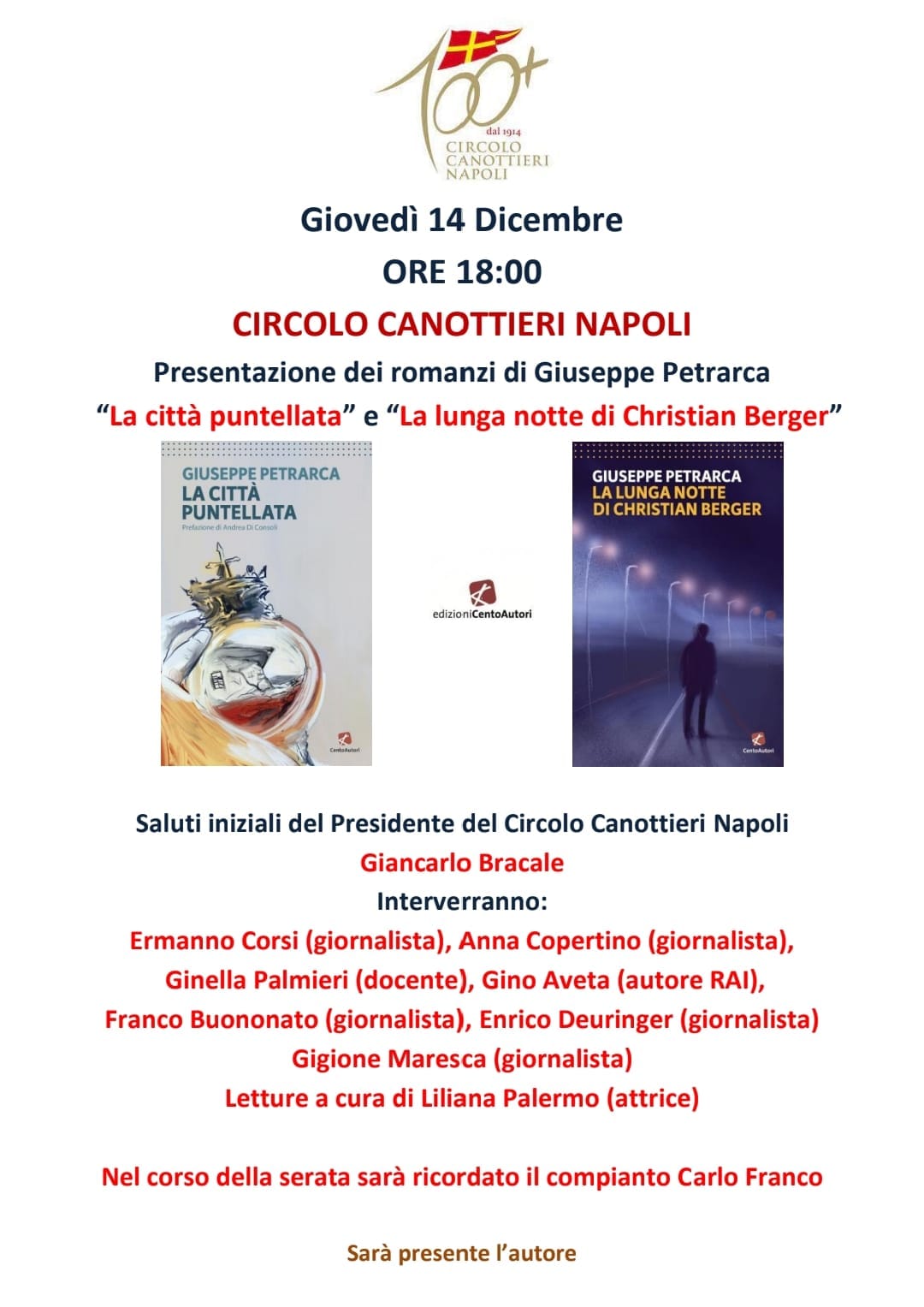 Domani, giovedì 14 dicembre, alle ore 18.00, presso il Circolo Canottieri Napoli, si terrà la presentazione dei romanzi di Giuseppe Petrarca “La città puntellata” e “La lunga notte di Christian Berger” (Cento Autori), disponibile on line e in libreria dallo scorso 27 ottobre, per la collana “L’Arcobaleno”, dedicata alla narrativa italiana. Un percorso narrativo attraverso i due romanzi.
