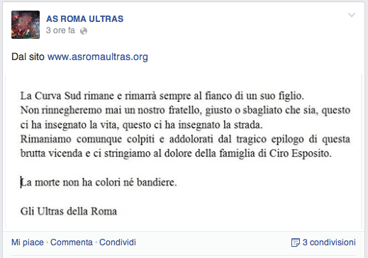 Continuano a farsi sentire gli strascichi della tragica morte di Ciro Esposito, il tifoso napoletano ferito da un romanista durante gli scontri dell’Olimpico in occasione della finale di Coppa Italia Fiorentina – Napoli. Dopo il cordoglio espresso ieri in una lettera di un tifoso romanista nei confronti di Ciro e della sua famiglia, oggi il comunicato ufficiale diffuso dalla Curva Sud della Roma fa gelare il sangue nelle vene.