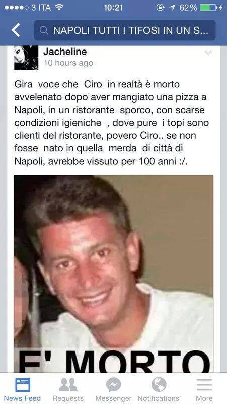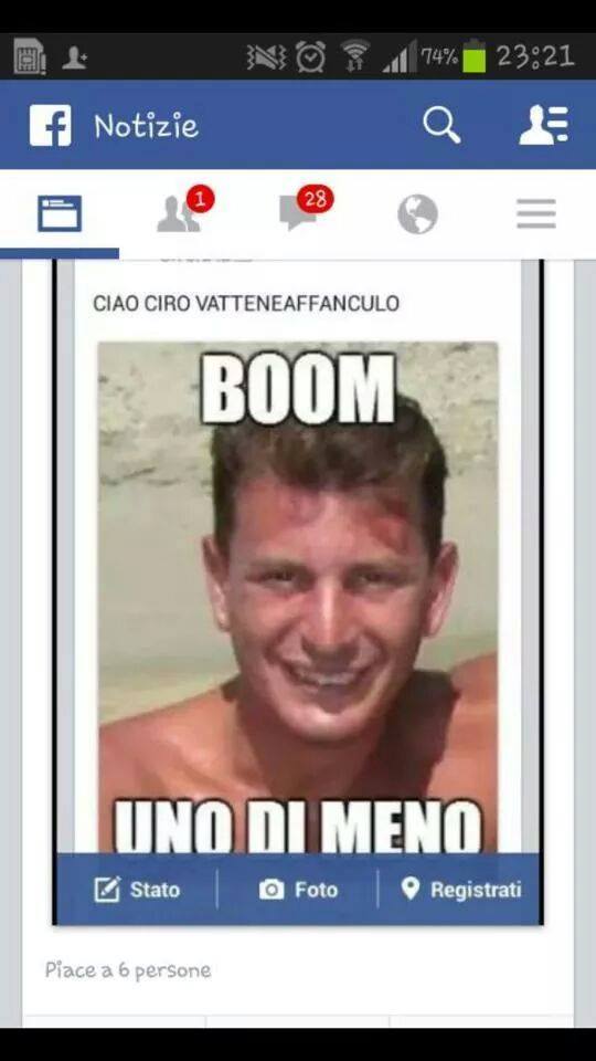 In un paese dove si è capaci di piangere per una sconfitta dell’Italia ai Mondiali di calcio sembra non esserci rispetto nemmeno per la morte di un ragazzo la cui unica colpa è quella di essere napoletano. In questi minuti su Facebook stanno impazzando insulti provenienti da Roma che hanno scatenato indignazione tra i napoletani e tra i familiari di Ciro.