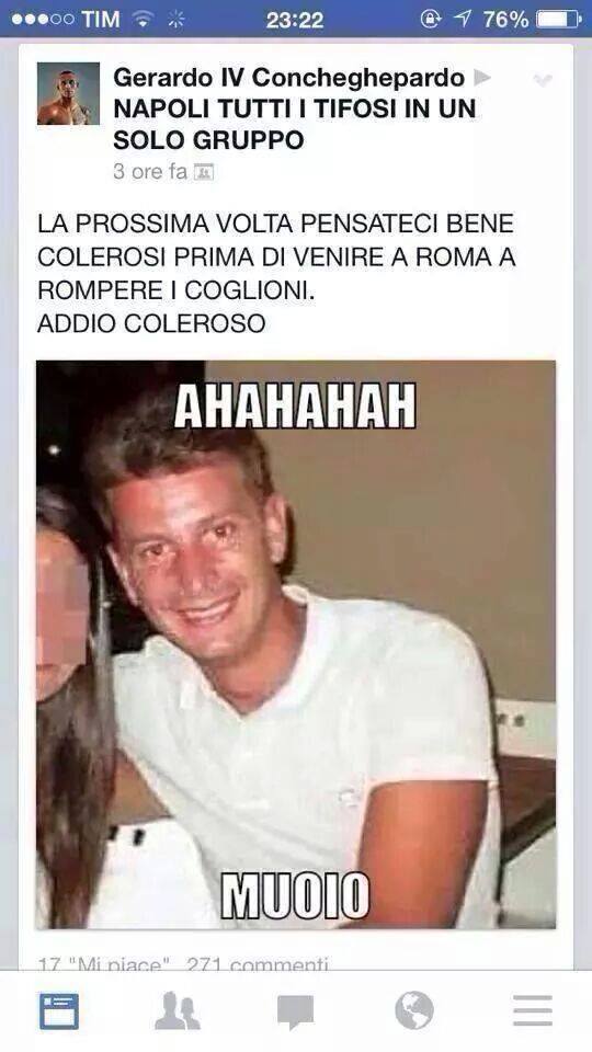 “La prossima volta prima di venire a Roma a rompere i coglioni pensateci bene. Addio Coleroso“. Questo il testo di uno dei messaggi lanciati su una bacheca facebook di un utente romano. La solidarietà pervenuta ai familiari da un grande numero di esponenti del mondo politico, sportivo e dello spettacolo non sono bastati a mitigare l’ignoranza di chi “odia” per gioco.
