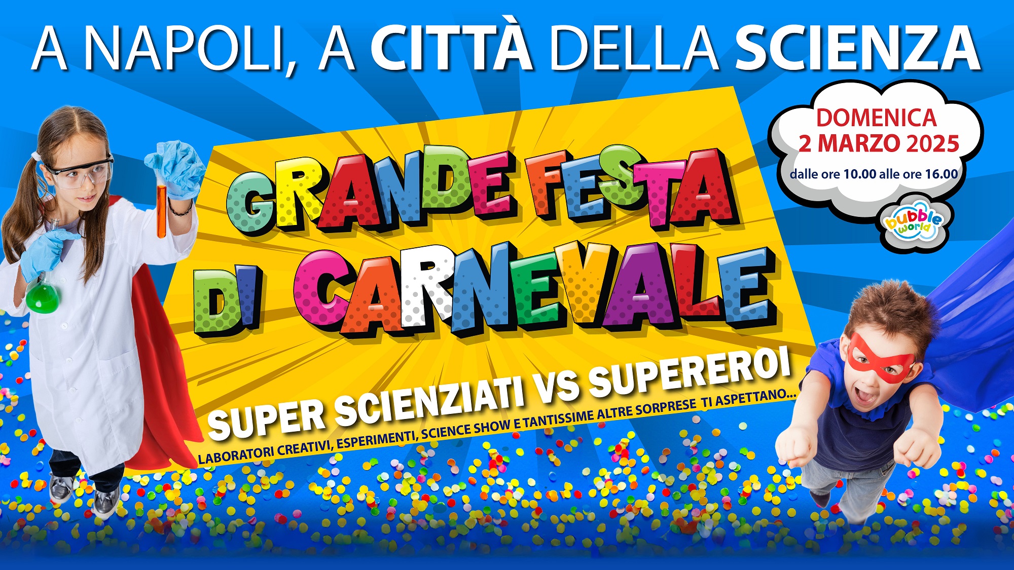 A seguire, domenica 2 Marzo, la tanto attesa GRANDE FESTA DI CARNEVALE – SCIENZIATI CON SUPERPOTERI! Sarà un evento straordinario in cui scienza e supereroi si incontreranno per una giornata molto speciale.