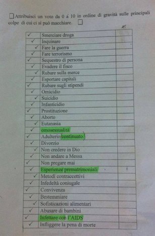 Indicare con un voto che va da uno a dieci le “colpe” di cui ci si può macchiare nel corso della propria vita. Questo il compito assegnato da un insegnante di Religione di Perugia ai suoi studenti.