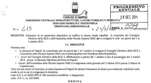Il nostro dubbio è sorto non a partire da voci di popolo ma in base a quanto pubblicato il 29 settembre 2014 con l’Ordinanza dirigenziale della Direzione Centrale Infrastrutture, Lavori pubblici e Mobilità, Servizio mobilità sostenibile. Quest’ultima avvisava che dal 1 al 3 ottobre 2014 la città di Napoli ospiterà il Consiglio Direttivo della BCE e l’Assemblea delle Piccole Imprese SME. Le sedi dei due eventi saranno rispettivamente la Stazione Marittima del Porto di Napolì e il Museo di Capodimonte.