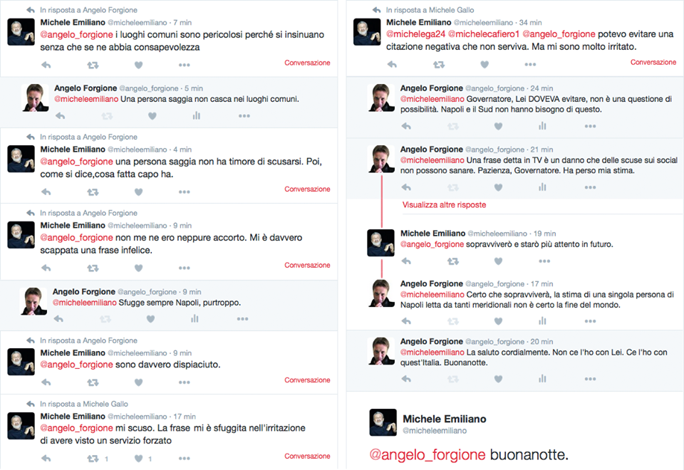 “Punto 1: Il sistema giudiziario di Napoli non è diverso da quello di Bari, ed Emiliano non può insinuare che gli uffici giudiziari di Napoli e della Campania reagiscono diversamente e meno prontamente nei confronti di chi commette reati. Che poi lo Stato al Sud sia sostanzialmente assente è certo, ma Bari e Napoli sono entrambe meridionali. Irrispettoso!