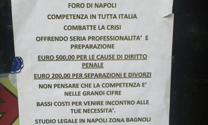 500 euro per le cause penali, appena 200 per separazioni e divorzi. “Non pensare che la competenza è nelle grandi cifre. Bassi costi per venire incontro alle tue necessità“. Il volantino è apparso davanti a un supermercato nella zona Cavalleggeri d’Aosta, quartiere di Fuorigrotta. A essere sponsorizzate, in un italiano dimentico dei congiuntivi che peraltro fa venire dubbi sulla effettiva “competenza” millantata, sono prestazioni legali a costi contenuti.