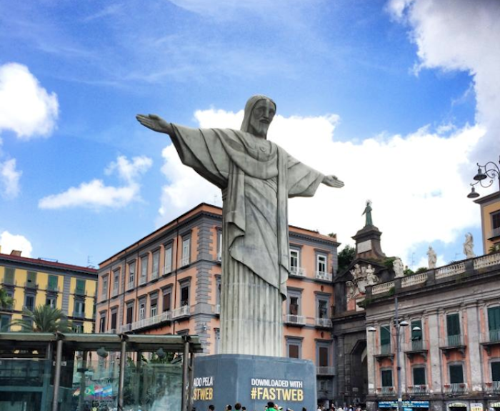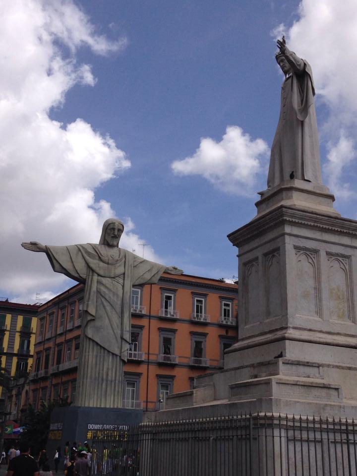 No, non è un fotomontaggio. Una perfetta riproduzione del famosissimo Cristo di Rio, il “Redentore” che veglia sulla capitale “spirituale” del Brasile dal colle di Corcovado, è sbarcato a Napoli, rubando letteralmente la scena all’altrettanto famosa, per noi napoletani, statua di Dante Alighieri, da cui la piazza prende nome.