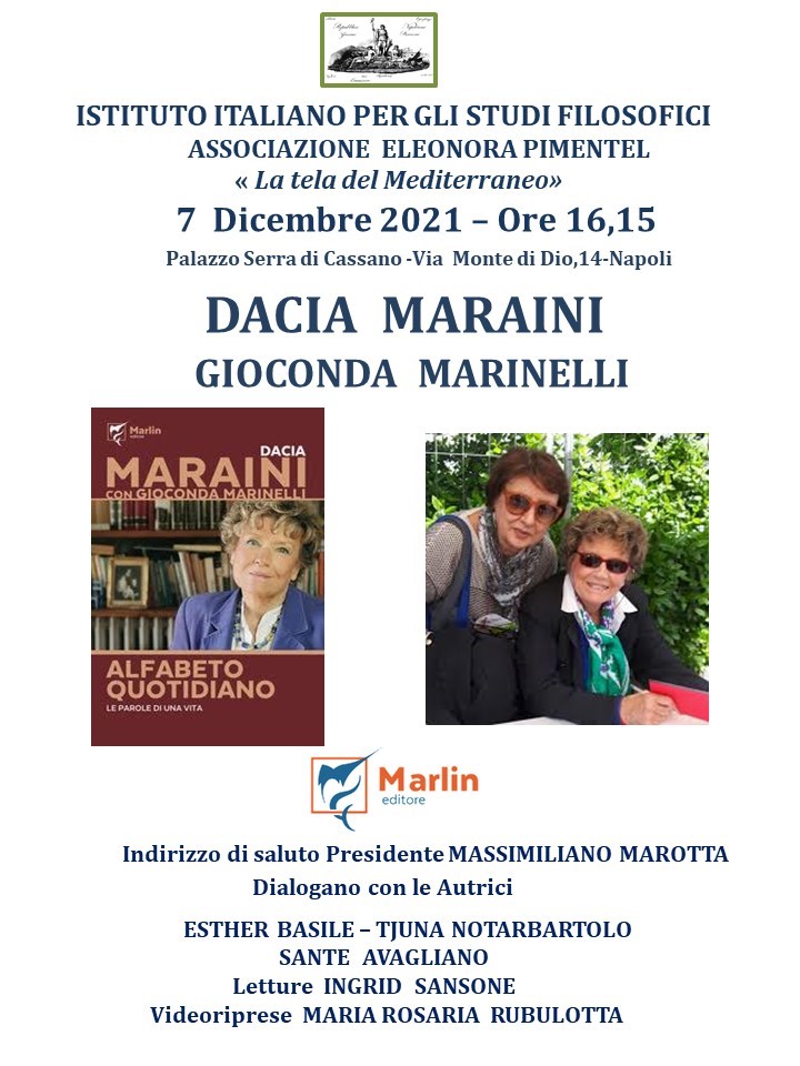 Dacia Maraini si racconta per la prima volta in un ritratto intimo, personale, inedito. “Alfabeto quotidiano. Le parole di una vita” (collana La camera del fuoco, 128 pp., 13,50 euro), Dacia Maraini con Gioconda Marinelli, è un libro Marlin editore, casa editrice fondata da Tommaso e Sante Avagliano. La presentazione a Napoli è in programma martedì 7 dicembre, alle 16,15, all’Istituto Italiano per gli Studi Filosofici, in via Monte di Dio n. 14, in collaborazione con l’associazione Eleonora Pimentel “La tela del Mediterraneo”, nel segno di uno scambio culturale trentennale fra l’Istituto e Maraini, più volte ospite del settecentesco Palazzo Serra di Cassano che vide la Rivoluzione partenopea ed è culla della cultura internazionale. Dopo i saluti di Massimiliano Marotta, presidente dell’Istituto Italiano per gli Studi Filosofici, e dell’editore Sante Avagliano, intervengono Esther Basile, filosofa, poetessa e curatrice del Premio “L’Iguana – Anna Maria Ortese”, ideatrice del Festival della Letteratura e saggistica filosofica che giunge alla XV edizione e insignita di due Medaglie dal Presidente della Repubblica Giorgio Napolitano, e la giornalista e scrittrice Tjuna Notarbartolo, che dirige il Premio letterario “Elsa Morante”, in un confronto con Dacia Maraini e Gioconda Marinelli. Letture a cura dell’attrice e produttrice teatrale Ingrid Sansone e videoriprese a cura di Maria Rosaria Rubulotta. Ingresso libero con obbligo di Green Pass con documento di identità o, in alternativa, l’esito negativo di un tampone eseguito entro 48 ore dalla data dell’evento.