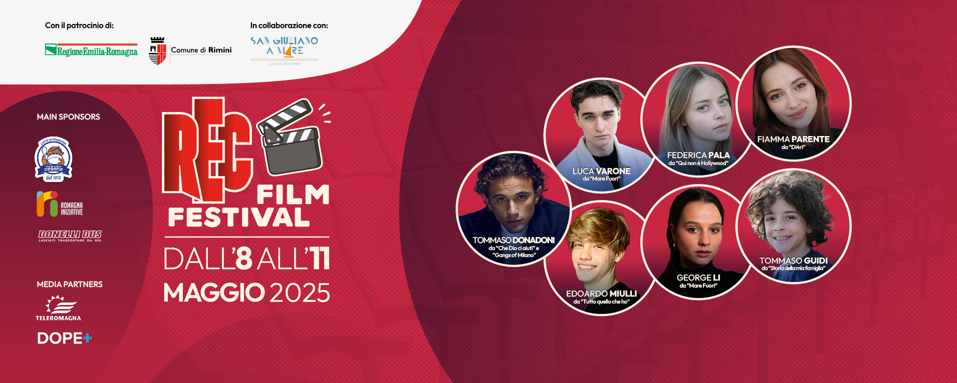 Ad impreziosire la quattro-giorni riminese saranno presenti personaggi in vista ed attesissimi dalla bella gioventù del REC Film Festival. Basti citare gli attori Luca Varone e George Li (protagonisti della serie cult “Mare Fuori”), Tommaso Donadoni (interprete della fiction “Che Dio ci aiuti” e della serie “Gangs of Milano“), Fiamma Parente (dalla serie Netflix “Diari“), Federica Pala (protagonista della serie di Disney+ “Qui non è Hollywood“), Edoardo Miulli (dalla serie di Canale 5 “Tutto quello che ho“) e Tommaso Guidi (protagonista della serie Netflix “Storia della mia famiglia”). Nomi, cognomi e prodotti televisivi di appeal che arricchiranno le giornate e le vie della città.