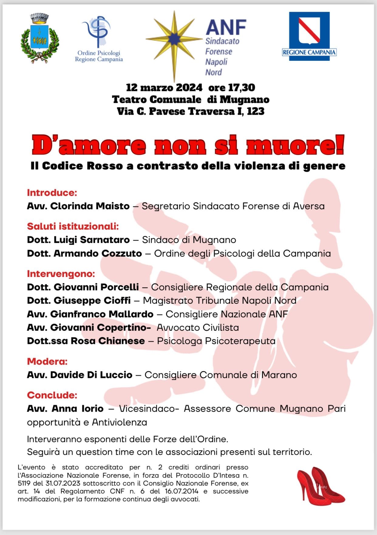Martedì 12 marzo 2024 alle ore 17.30 presso il Teatro Comunale di Mugnano (via Cesare Pavese Traversa I, 123) è stato organizzato con il Sindacato Forense Napoli Nord, contro la violenza di genere, l’evento “D’amore non si muore!”.