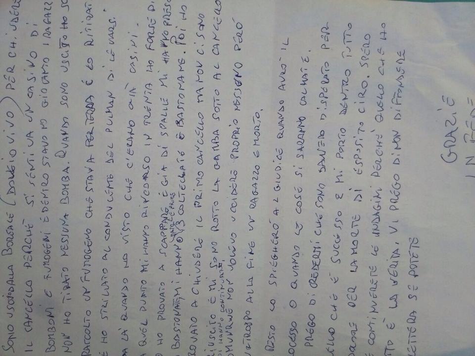Questi alcuni passaggi salienti della lettera di confessione: “Voglio dire che è vero, alla fine i colpi l’ho esplosi io ma senza mirare. Ero pieno di sangue dappertutto. Mi stavano ammazzando punto e basta. Non volevo uccidere proprio nessuno però purtroppo alla fine un ragazzo è morto. Sono uscito dalla Boreale dove vivo per chiudere il cancello perchè si sentiva un casino di bomboni e fumogeni e dentro stavano giocando i ragazzi. Non ho tirato nessuna bombone, quando sono uscito ho solo raccolto un fumogeno che stava per terra e l’ho tirato e ho strillato al conducente del pullman di levarsi da là quando ho visto che c’erano già casini. A quel punto mi hanno rincorso in trenta, forse di più. Ho provato a scappare, e già di spalle mi hanno preso e mi hanno dato le prime tre coltellate”.