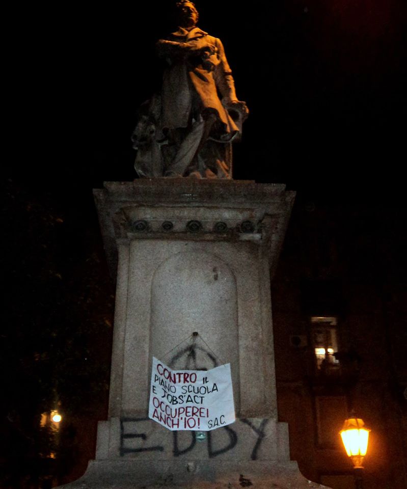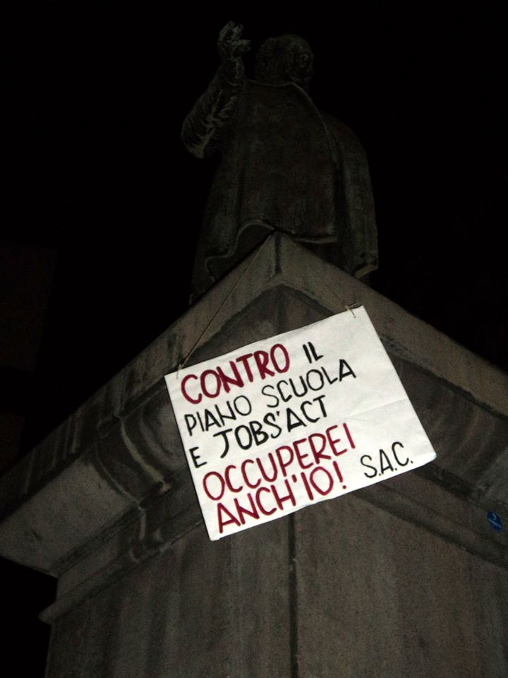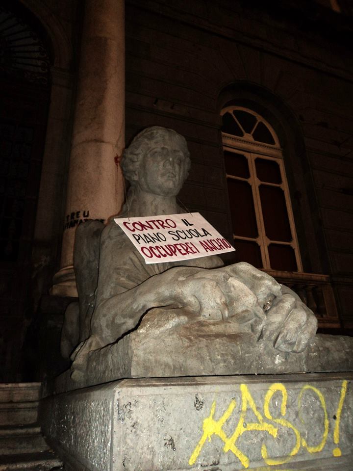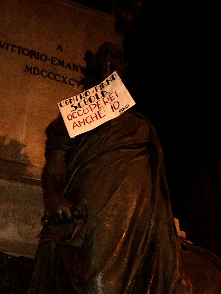 I monumenti napoletani scendono in piazza insieme agli studenti in protesta. Dante contro Renzi, ma anche il Corpo di Napoli, Vittorio Emanuele e tanti altri: al collo dei monumenti un cartello con su scritto “Contro il Piano Scuola e lo Jobs Act occuperei anche io!“. I ragazzi dei Collettivi hanno lanciato questa provocazione coinvolgendo alcuni dei più importanti simboli napoletani contro lo Jobs Act e il Piano scuola del presidente del Consiglio Matteo Renzi. La protesta continuerà e arriverà al suo climax il prossimo lunedì, quando gli studenti di gran parte degli Istituti superiori partenopei, che stanno al momento occupando le scuole, parteciperanno ad una conferenza stampa il prossimo lunedì 1 dicembre alle ore 13:00 presso i cancelli dell’istituto Giordani-Striano in via Caravaggio 184.