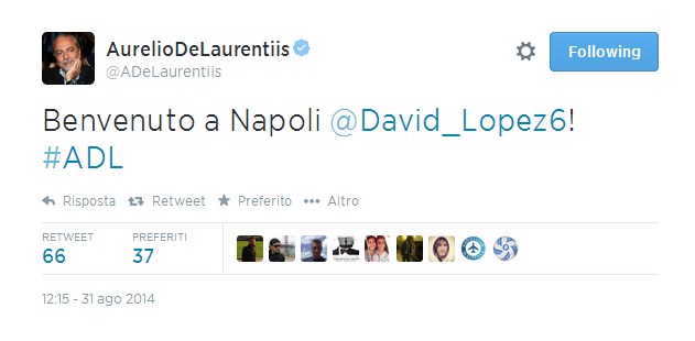La SSC Napoli ha ufficializzato l’acquisto di David Lopez dall’Espanyol di Barcelona. Il calciatore ha firmato un contratto di 5 anni. Queste le sue prime parole: “Sono felice di essere a Napoli, un Club importante con un pubblico meraviglioso“. Anche il Presidente De Laurentiis ha voluto salutare il nuovo acquisto azzurro con un tweet, dando il benvenuto in città al mediano spagnolo.