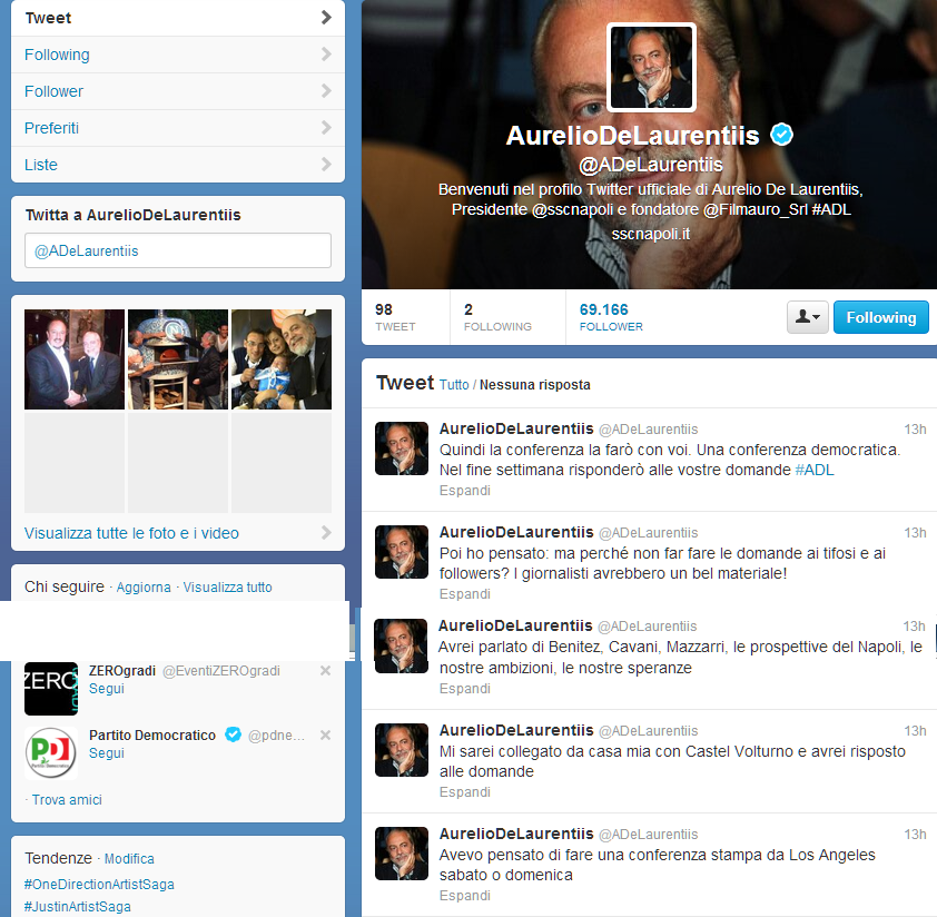 Un modo per interagire attivamente con i tifosi del Napoli: così era nata infatti l’idea del patron azzurro di gestire un proprio account su Twitter, che ha attivato il 17 marzo 2013, in occasione della 400esima partita del Napoli sotto la sua gestione.