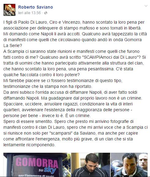 Di Lauro liberi: ecco il messaggio di Roberto Saviano su Facebook