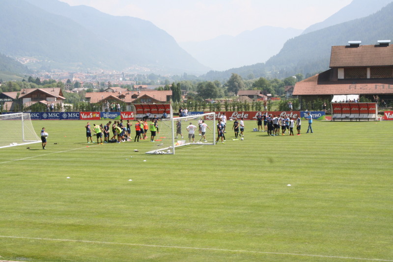 A seguire, campo diviso in due parti con partita 6 contro 6. In evidenza Hamsik, Insigne, Mertens (rapido nel dribbling e nella guida della palla), De Sanctis.