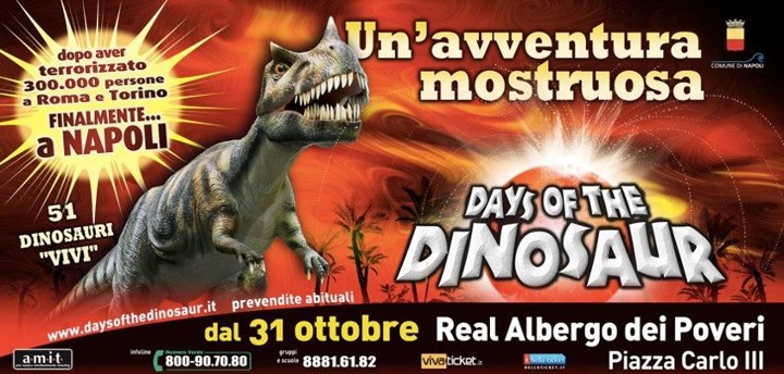 Dopo il grande successo riscosso a Roma e Torino, dove ha appassionato 300.000 visitatori, DAYS OF THE DINOSAUR arriva a Napoli dal 31 ottobre, allestita in uno degli spazi espositivi più suggestivi della città: il Real Albergo dei Poveri. 50 dinosauri “vivi” in 12 diversi scenari porteranno il pubblico indietro di 250 milioni di anni: alla scoperta di un mondo perduto. Dal gigantesco Tyrannosaurus al più piccolo Archeaopteryx, i dinosauri tornano in vita grazie ad una sofisticata tecnologia che ha permesso di creare robot che sfiorano la perfezione.