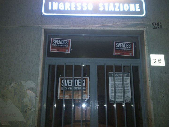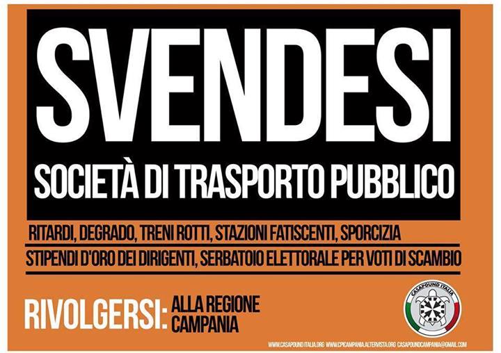 Malfunzionamento e degrado della Circumvesuviana, ecco come CasaPound protesta contro i disagi in cui si imbatte quotidianamente un pendolare utilizzando questo trasporto pubblico locale. Ritardi, incidenti, scarsa igiene e soppressione dei treni sono solo alcuni, e durante la notte del 17 luglio 2014, CasaPound Campania ha deciso di affiggere sui muri di numerose stazioni questi particolari manifesti che recitano: “Svendesi società di trasporto pubblico“.