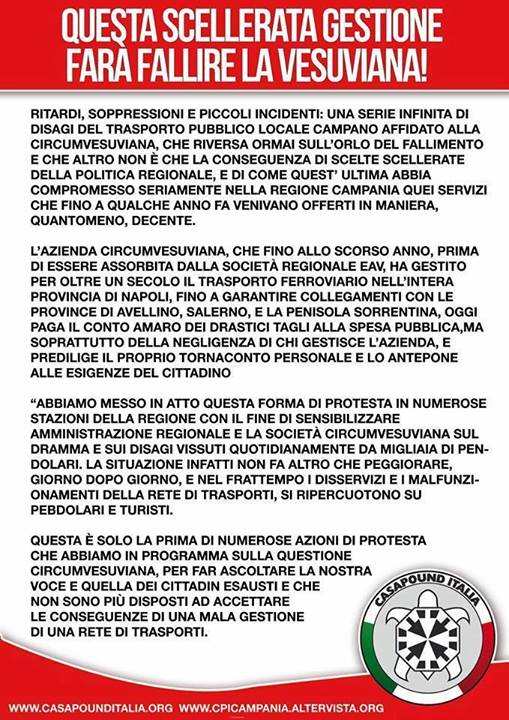 Solo l’anno scorso la società Circumvesuviana riusciva ancora andare un servizio quanto meno dignitoso, ma da quando è stata assorbita dalla società Eav. Almeno è questo quello che afferma Ferdinando Raiola, coordinatore campano di CasaPound Italia. “Abbiamo messo in atto questa forma di protesta in numerose stazioni della Regione – prosegue Ferdinando Raiola – con il fine di sensibilizzare amministrazione regionale e la società Circumvesuviana sul dramma e sui disagi vissuti quotidianamente da migliaia di pendolari. A Napoli e provincia quelle interessate dalla protesta sono state Gianturco, Ponticelli, Poggioreale, Brusciano, Poggiomarino, San Giorgio a Cremano, Portici, Ercolano, Torre Annunziata, Ottaviano, Pomigliano d’Arco, San Giuseppe Vesuviano, Sant’Anastasia, Terzigno, e Villa Visconti; in provincia di Salerno quelle di Sarno e Scafati; in provincia di Avellino Baiano; mentre in penisola sorrentina le stazioni sono state quelle di Sorrento, Sant’Agnello, Piano di Sorrento, Meta e Vico Equense.”