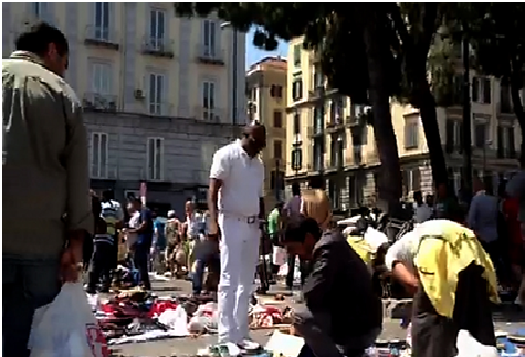 Si discute sui prezzi, si spintona, gli sguardi saettano dalla mercanzia al volto accanto, alcuni uomini agli angoli della piazza sembrano tenere d’occhio non si sa cosa, finché non giungono due carabinieri che cominciano a smantellare con le buone il mercato allestito mostrando l’utilità dei teli. Con mani leste, gli improvvisati commercianti riescono a fare un fagotto ed avviarsi celermente fra gli alberi circostanti o nei vicoli adiacenti, nessuno si oppone, annuiscono, sorridono, poi vanno via. Almeno per un po’. Fino a quando i carabinieri non vanno via.