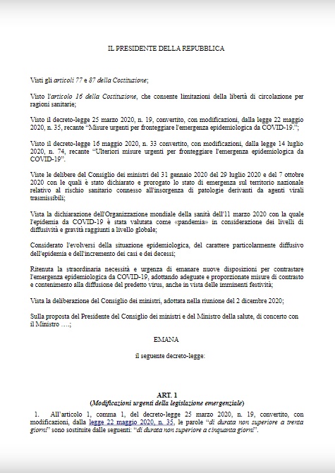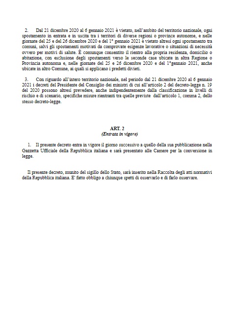 SECONDE CASE – Il dl stabilisce che “sarà sempre possibile, anche dal 21 dicembre al 6 gennaio, rientrare alla propria residenza, domicilio o abitazione; dal 21 dicembre 2020 al 6 gennaio 2021 sarà vietato spostarsi nelle seconde case che si trovino in una Regione o Provincia autonoma diversa dalla propria. Il 25 e 26 dicembre 2020 e il 1° gennaio 2021 il divieto varrà anche per le seconde case situate in un Comune diverso dal proprio. Infine, le nuove norme stabiliscono che i DPCM emergenziali, indipendentemente dalla classificazione in livelli di rischio e di scenario delle diverse Regioni e Province autonome, possano disporre, nel periodo dal 21 dicembre 2020 al 6 gennaio 2021, su tutto il territorio nazionale, specifiche misure tra quelle già previste elencate dalle norme primarie”.