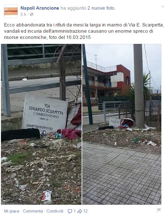La pagina Facebook Napoli Arancione ha fotografato e diffuso le immagini che vedono abbandonata la targa di Eduardo Scarpetta tra i rifiuti accompagnandole da un commento: “Ecco abbandonata tra i rifiuti da mesi la targa in marmo di Via E. Scarpetta, vandali ed incuria dell’amministrazione causano un enorme spreco di risorse economiche, foto del 16.03.2015“.
