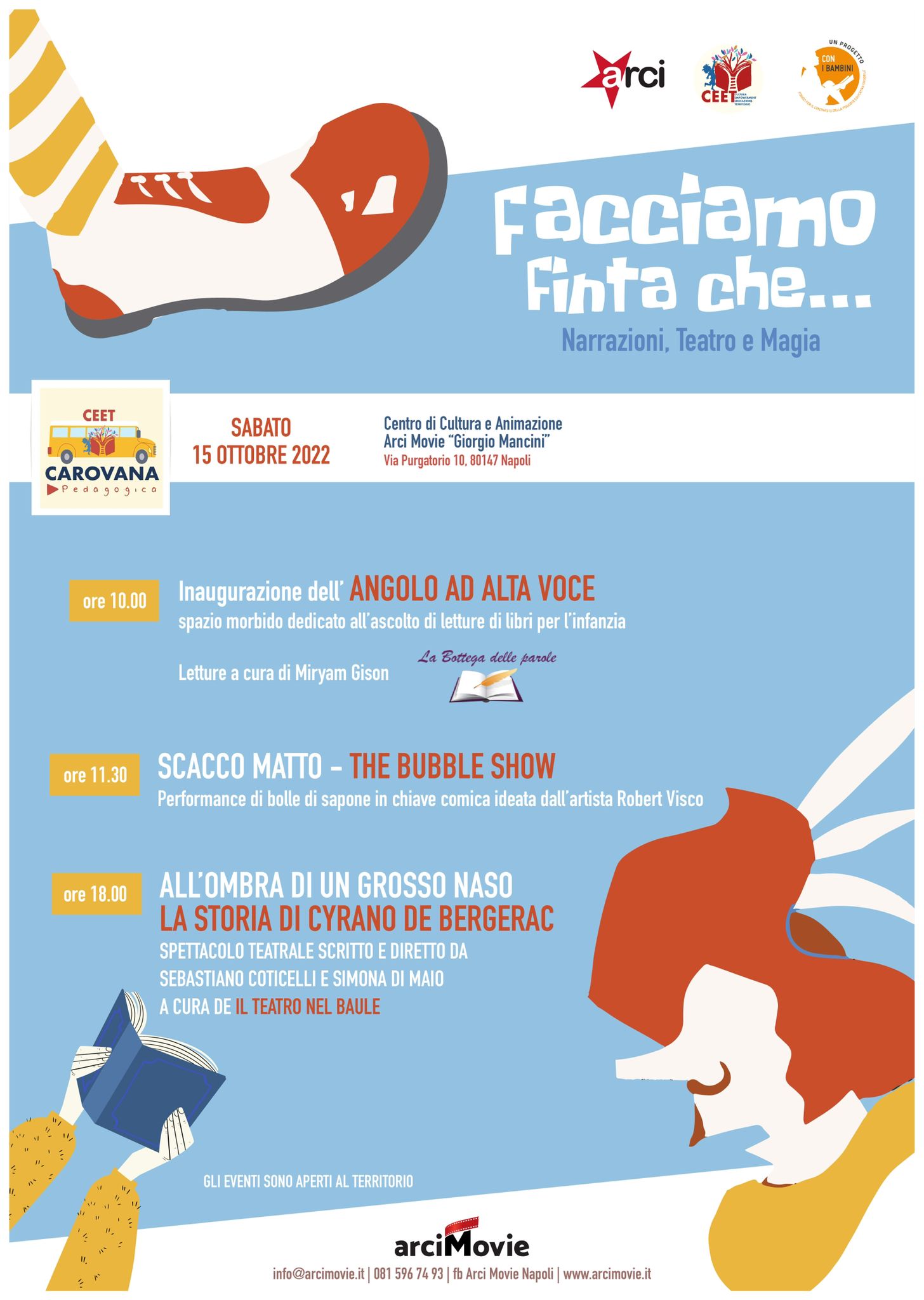Il progetto lascia una traccia importante nel quartiere inaugurando al Centro di Cultura e Animazione Arci Movie Giorgio Mancini uno “Spazio morbido”, ovvero un punto di lettura e ascolto arricchito dalla piccola biblioteca di albi illustrati e libri per l’infanzia e l’adolescenza. Sarà il regalo della Carovana al quartiere grazie alla collaborazione con la casa editrice Sinnos. In seguito saranno i volontari e gli operatori dell’associazione Arci Movie a rendere disponibile gratuitamente questo luogo a scuole e famiglie in cui una lampada magica accoglierà i bambini, docenti, genitori e nonni in un’atmosfera magica capace di incantarli. L’angolo ad alta voce sarà inaugurato sabato 15 ottobre 2022 alle ore 10. Le letture saranno a cura di Miryam Gison della Bottega delle Parole di San Giorgio a Cremano. Seguirà alle 11:30 la performance di bolle di sapone in chiave comica ideata dall’artista Scacco Matto. La settimana si arricchisce con lo spettacolo teatrale All’ombre di un grosso naso, la storia di Cyrano De Bergerac, scritto e diretto da Sebastiano Coticelli e Simona Di Maio. Lo spettacolo, curato da Il teatro nel baule, è in programma alle ore 18. L’ingresso ai due eventi è aperto alla collettività e completamente gratuito.