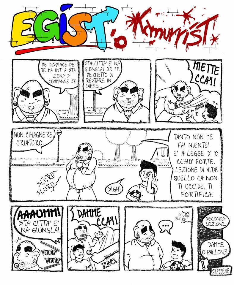 Il salone internazionale del fumetto, quindi, ospiterà Egíst ‘o kamurríst, fino ad oggi fumetto sostenuto esclusivamente dal web. La pubblicazione è finalizzata all’ulteriore diffusione del personaggio e, quindi, alla promozione di un impegno attivo contro la camorra. Le storie di Egísto vogliono spingere all’indignazione tramite il sorriso, esortando ciascuno a una piccola porzione di impegno attivo. Il libretto sarà disponibile allo stand Z01 assieme al secondo numero della rivista Antonio, a cura dell’associazione TerradiConfine: entrambe sono produzioni no profit.