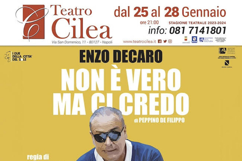 Quattro appuntamenti dal 25 al 28 gennaio al Cilea di Napoli per il ritorno teatrale di Enzo Decaro nello spettacolo “Non è vero ma ci credo”. Decaro con Massimo Troisi e Lello Arena è stato tra i protagonisti della nuova scuola napoletana della comicità moderna.