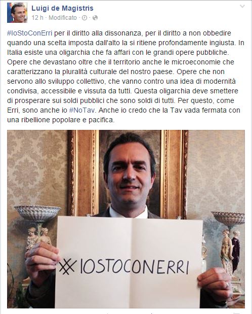 Ecco il messaggio del sindaco per Erri De Luca postato sulla pagina Facebook ufficiale di Luigi De Magistris: “#IoStoConErri per il diritto alla dissonanza, per il diritto a non obbedire quando una scelta imposta dall’alto la si ritiene profondamente ingiusta. In Italia esiste una oligarchia che fa affari con le grandi opere pubbliche. Opere che devastano oltre che il territorio anche le microeconomie che caratterizzano la pluralità culturale del nostro paese. Opere che non servono allo sviluppo collettivo, che vanno contro una idea di modernità condivisa, accessibile e vissuta da tutti. Questa oligarchia deve smettere di prosperare sui soldi pubblici che sono soldi di tutti. Per questo, come Erri, sono anche io #NoTav. Anche io credo che la Tav vada fermata con una ribellione popolare e pacifica”.