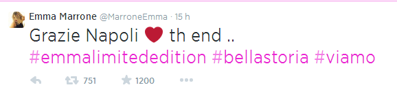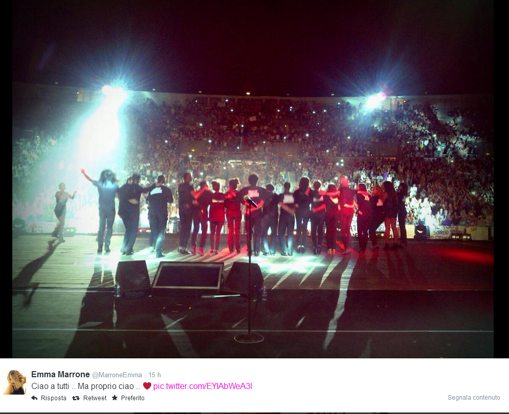 28 luglio 2014 l’Arena Flegrea gremita per Emma Marrone che ha concluso il suo tour estivo “Emma Limited Edition“. “Ultima data .. Ultimo viaggio .. E sento già il peso dell’assenza” così la cantante ha commentato sulla sua pagina Twitter poche ore prima del concerto di Napoli. Emma ha riproposto la scaletta di 20 brani completamente riarrangiati grazie alla sinergia tra la sua band e l’orchestra di 13 elementi diretta dal maestro Davide Di Gregorio. “È bellissimo chiudere l’Emma Limited Edition qui a Napoli” ha detto durante il concerto la cantante.