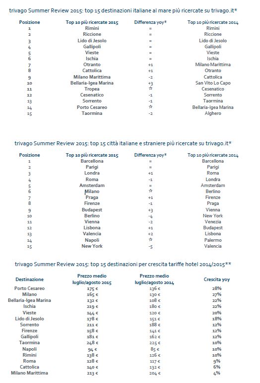 Per quanto riguarda invece la Top 15 delle destinazioni italiane al mare più ricercate su Trivago, la Campania e Napoli piazzano due località in classifica, Ischia che si piazza al sesto posto (stabile) e Sorrento che invece la troviamo in 13esima posizione (-1). A sorpresa manca Capri, forse nota come località troppo dispendiosa e quindi l’utente medio evita direttamente di cercarla. Al primo posto Rimini, seguita a ruota da Riccione.