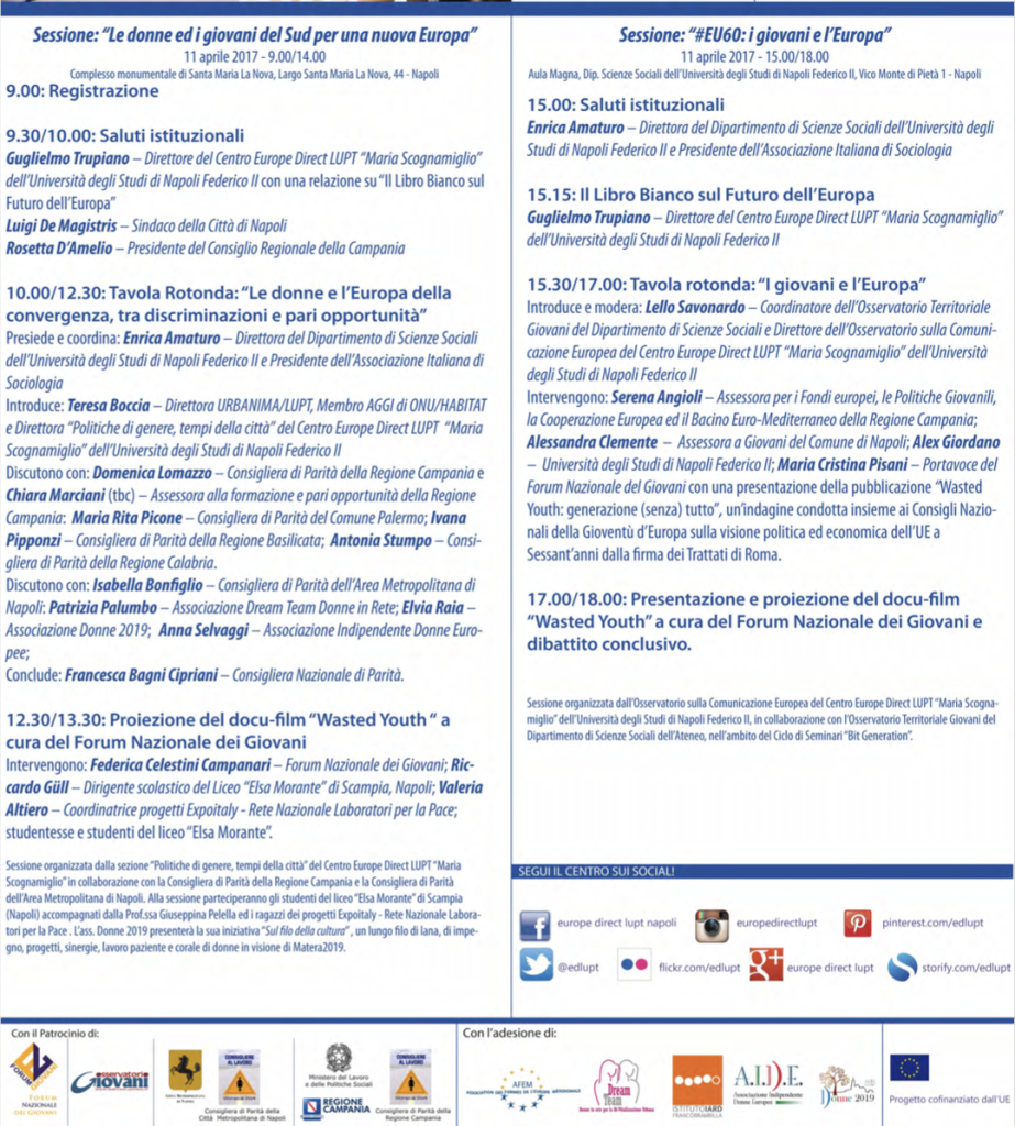 In occasione delle celebrazioni per i Sessant’Anni dei Trattati di Roma e dell’importante pubblicazione del Libro Bianco sul Futuro dell’Europa, il Centro Europe Direct LUPT “Maria Scognamiglio” dell’Università degli Studi di Napoli Federico II, parte del network della Commissione europea, organizza il giorno 11 aprile 2017 l’evento “#EU60. Cittadini, donne e giovani: prospettive e percezioni alla luce dei SessantʼAnni dei Trattati di Roma“, un’intera giornata dedicata all’Europa, alle donne ed ai giovani.