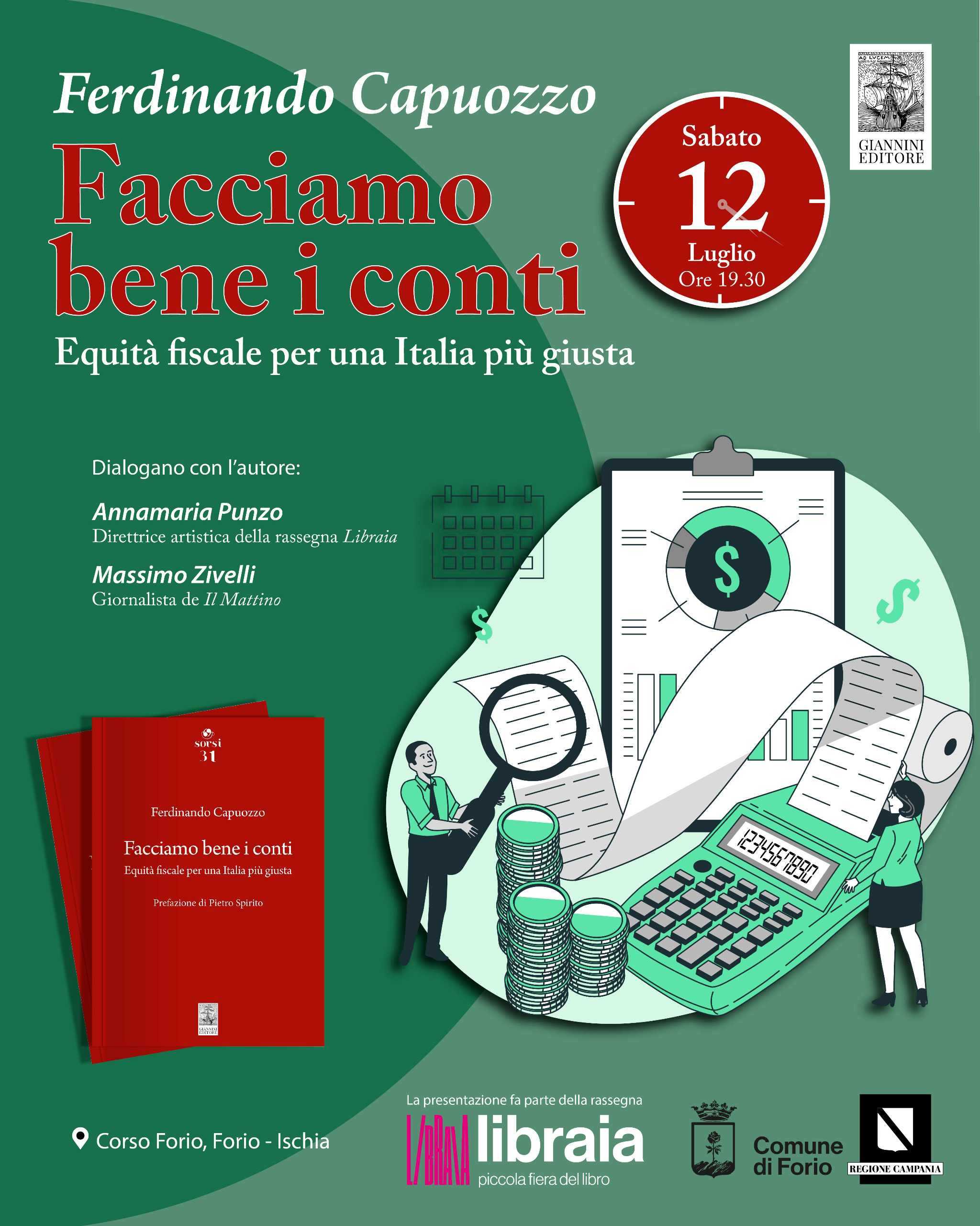 È fresco di stampa il saggio di Ferdinando Capuozzo: “Facciamo bene i conti”, che verrà presentato per la prima volta nella magica cornice dell’isola di Ischia. L’appuntamento è fissato per sabato 12 luglio alle ore 19,30, Corso Forio (Comune di Forio). La presentazione del libro, pubblicato dalla Giannini Editore nella nota collana Sorsi, si svolgerà nell’ambito della rassegna letteraria Libraia. Dialogheranno con l’autore: la direttrice artistica della rassegna Annamaria Punzo e il giornalista del Il Mattino Massimo Zivelli.