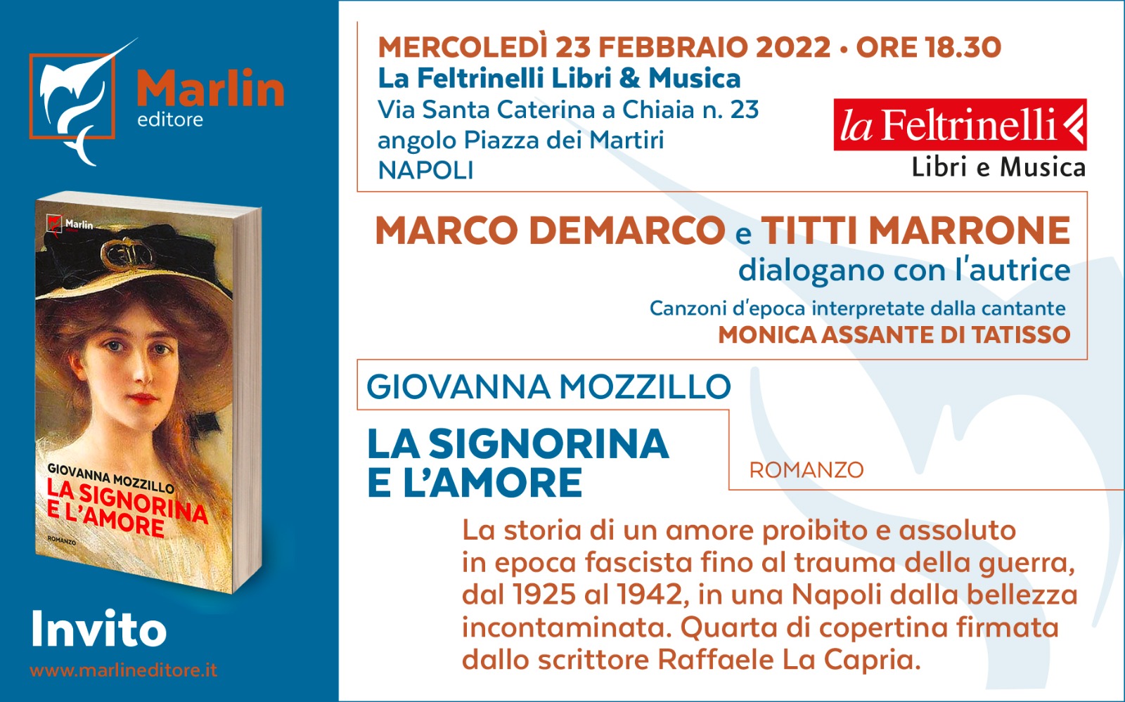 La storia di un amore proibito e assoluto in epoca fascista fino al trauma della guerra in una Napoli dalla bellezza incontaminata. Mercoledì 23 febbraio, alle 18.30, alla Feltrinelli di Napoli in via Santa Caterina a Chiaia n. 23 angolo Piazza dei Martiri, si presenta il romanzo “La signorina e l’amore” di Giovanna Mozzillo, Marlin editore. Con l’autrice, interverranno i giornalisti e scrittori Marco Demarco, già direttore del “Corriere del Mezzogiorno” ed editorialista del “Corriere della Sera”, e Titti Marrone, già responsabile delle pagine culturali del “Mattino” e in libreria con il romanzo “Se solo il mio cuore fosse pietra”, alla presenza dell’editore Sante Avagliano, che farà un breve saluto. La cantante e attrice Monica Assante Di Tatisso interpreterà alcune canzoni d’epoca in linea con il periodo al centro della narrazione, dal 1925 al 1942. Ingresso libero, con obbligo di Green Pass rafforzato e mascherina FFP2.
