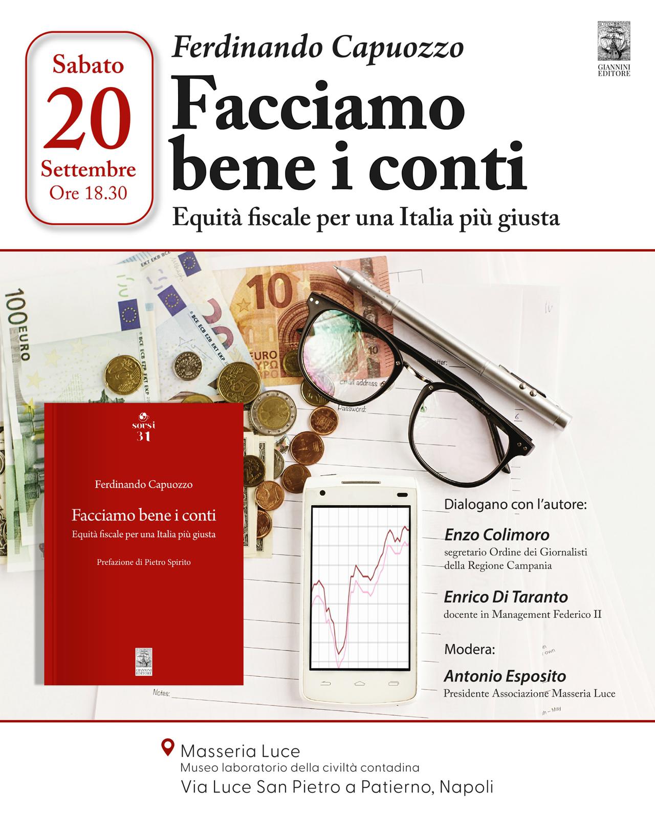 Week end all’insegna dell’economia, il libro “Facciamo bene i conti” di Ferdinando Capuozzo, sarà presentato presso la Masseria Luce (museo laboratorio della civiltà contadino), via Luce San Pietro a Patierno, Napol. Il saggio economico è pubblicato dalla Giannini Editore nella collana Sorsi. L’appuntamento è fissato per sabato 20 settembre alle ore 18,30. Dialogheranno con l’autore: il segretario dell’Ordine dei Giornalisti della Campania Enzo Colimoro, il docente in Management Federico II Enrico Taranto. Modera Antonio Esposito, presidente dell’Associazione Masseria Luce.
