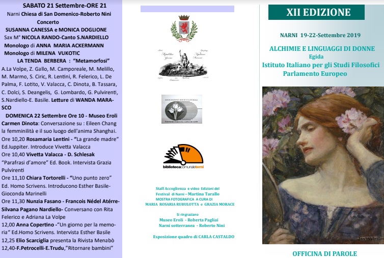 E’ giunto alla dodicesima edizione il Festival della Letteratura “Alchimie e linguaggi di donne” che si svolge al Museo Eroli di Narni dal 19 al 22 settembre 2019, sotto l’Egida dell’Istituto Italiano per gli Studi Filosofici di Napoli e del Parlamento Europeo, ideato e diretto dalla filosofa Esther Basile. Direttrice artistica Rosy Rubulotta. L’evento ha ricevuto due medaglie al valore dal presidente Napolitano.
