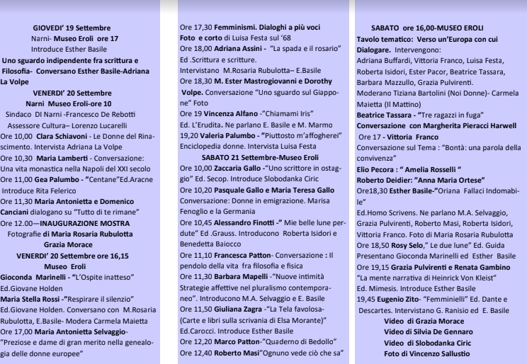 Un viaggio corale con l’intento di confrontare linguaggi, riti, pratiche, con un programma fitto e pieno di spessore che unisce intelligenze, pensieri, saperi e speranze di donne. Un’officina di parole: conversazioni con Maria Lamberti, Maria Ester Mastrogiovanni, Gea Palumbo, Clara Schiavoni, Maria Antonietta Vito, Domenico Canciani, Maria Antonietta Selvaggio, Gioconda Marinelli, Anna Copertino, Valeria Palumbo, Elio Pecora converserà su Amelia Rosselli, Grazia Pulvirenti, Renata Gambino, Pasquale Gallo, Maria Teresa Gallo, Zaccaria Gallo, Vivetta Valacca, Francesca Patton, Chiara Tortorelli, Barbara Mapelli, Carmen Dinota,Rosy Selo, Francesco Terracciano, Nunzia Fasano, Roberto Masi, Giuliana Zagra etc.
