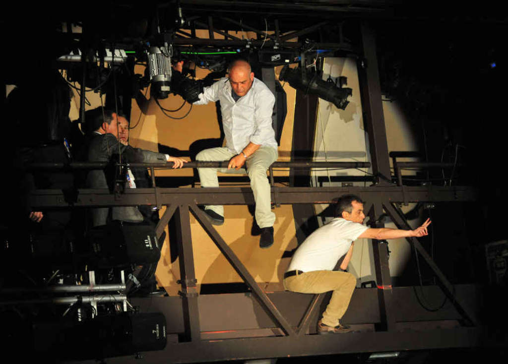Sono urla e grida che provengono da una impalcatura sul fondo del teatro, si tratta di due uomini che minacciano di gettarsi di sotto in caso di mancata attenzione, gridano e implorano che venga presa una lettera da far leggere sul palco per ottenere l’attenzione di qualche politico o persona influente. A stringerla tra le mani uno dei due uomini sospesi sull’impalcatura.