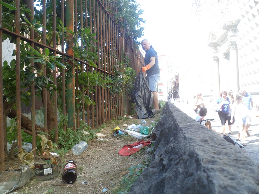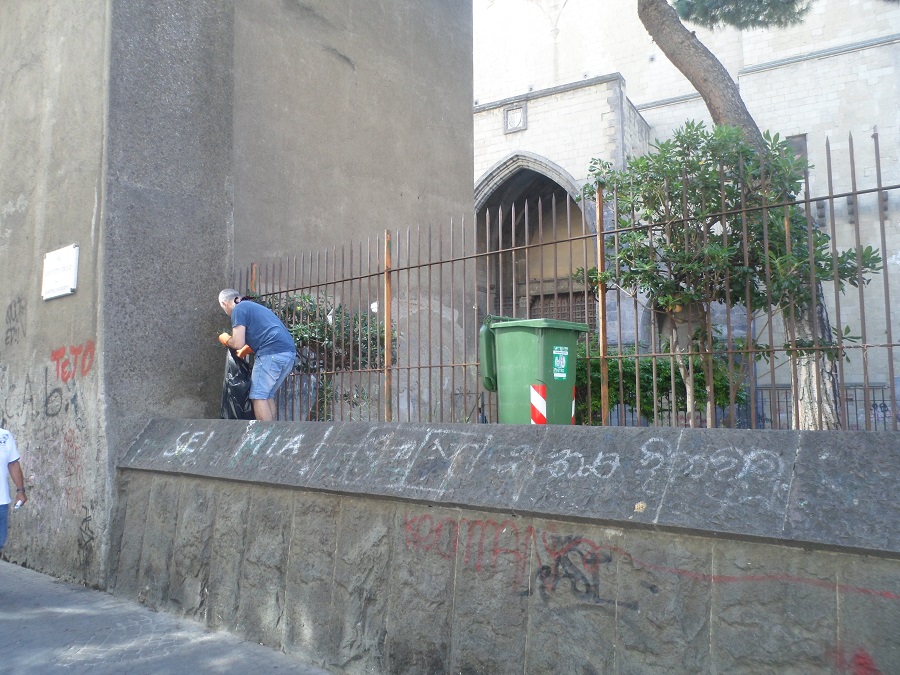 Tornano a far discutere i giardinetti della Basilica di Santa Chiara. Nonostante l’appello lanciato più di due settimane fa dal consigliere della II municipalità Pino de Stasio, i giardinetti continuavano ad essere ricettacolo di bottiglie di vetro e di ogni genere di rifiuto. Una situazione non sostenibile per una città a vocazione turistica come Napoli. Vista l’assenza di ogni tipo di intervento di pulizia de Stasio ha deciso di intervenire personalmente e lo ha fatto nel più semplice dei modi. Si è armato di bidone del vetro, di un sacco per l’indifferenziata, un paio di guanti e ha ripulito in prima persona tutta l’area.