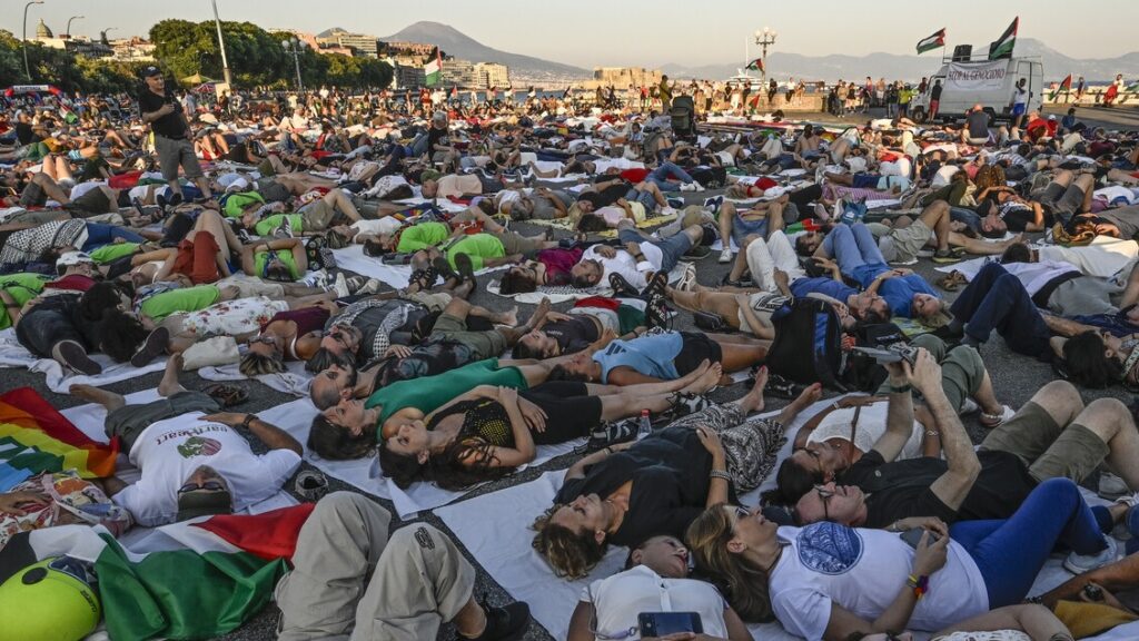 Tante le bandiere palestinesi presenti al flash mob che ha catturato l’attenzione anche di molti napoletani con le loro famiglie che passeggiavano sul lungomare. “A Gaza vorremmo sentire il rumore della vita, ma oggi si sente solo il rumore della morte” ha detto alla fine della manifestazione Susan Fatayer, della comunità palestinese, mentre Omar Suleiman ha ribadito la richiesta di “una chiara condanna del genocidio da parte del sindaco di Napoli”.
