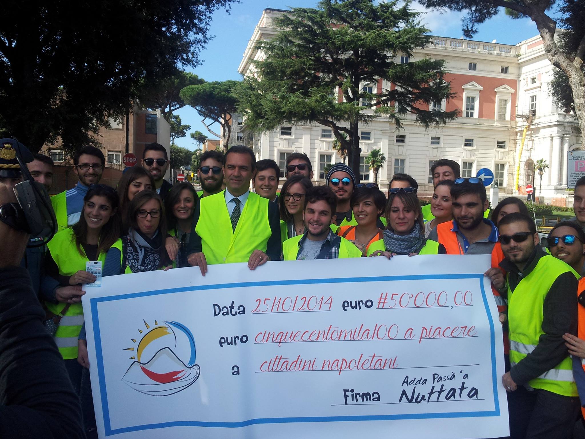 Anche il sindaco Luigi De Magistris ha partecipato all’iniziativa, indossando a sua volta il giubbetto catarifrangente e lasciandosi immortalare insieme ai giovani manifestanti dietro un maxi assegno di 50mila euro “a piacere”, la somma dei proventi dell’attività illecita dei parcheggiatori confiscati dalla Polizia Municipale nel solo 2013, che i ragazzi di “Adda passa’ ‘a nuttata” hanno simbolicamente restituito alla cittadinanza e che saranno destinati a un’opera di decoro urbano.