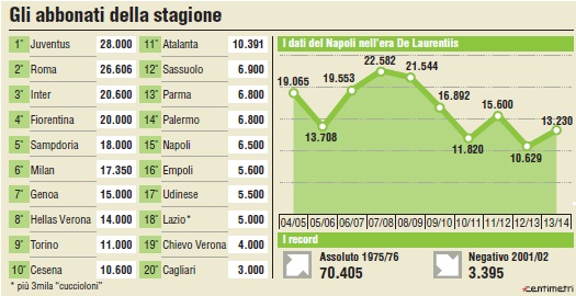 Secondo quanto riportato oggi da Il Mattino, sono solo 6.500 gli abbonati alla nuova stagione del Napoli. Un vero e proprio flop se si considera che la passata stagione erano circa il doppio. In serie A persino Sassuolo, Atalanta e Cesena hanno venduto più abbonamenti. Quello di quest’anno è il dato più basso registrato da quando c’è il presidente De Laurentiis alla guida della società, ma il record negativo resta quello del 2011 con 3.395 tessere staccate. Ecco il grafico.