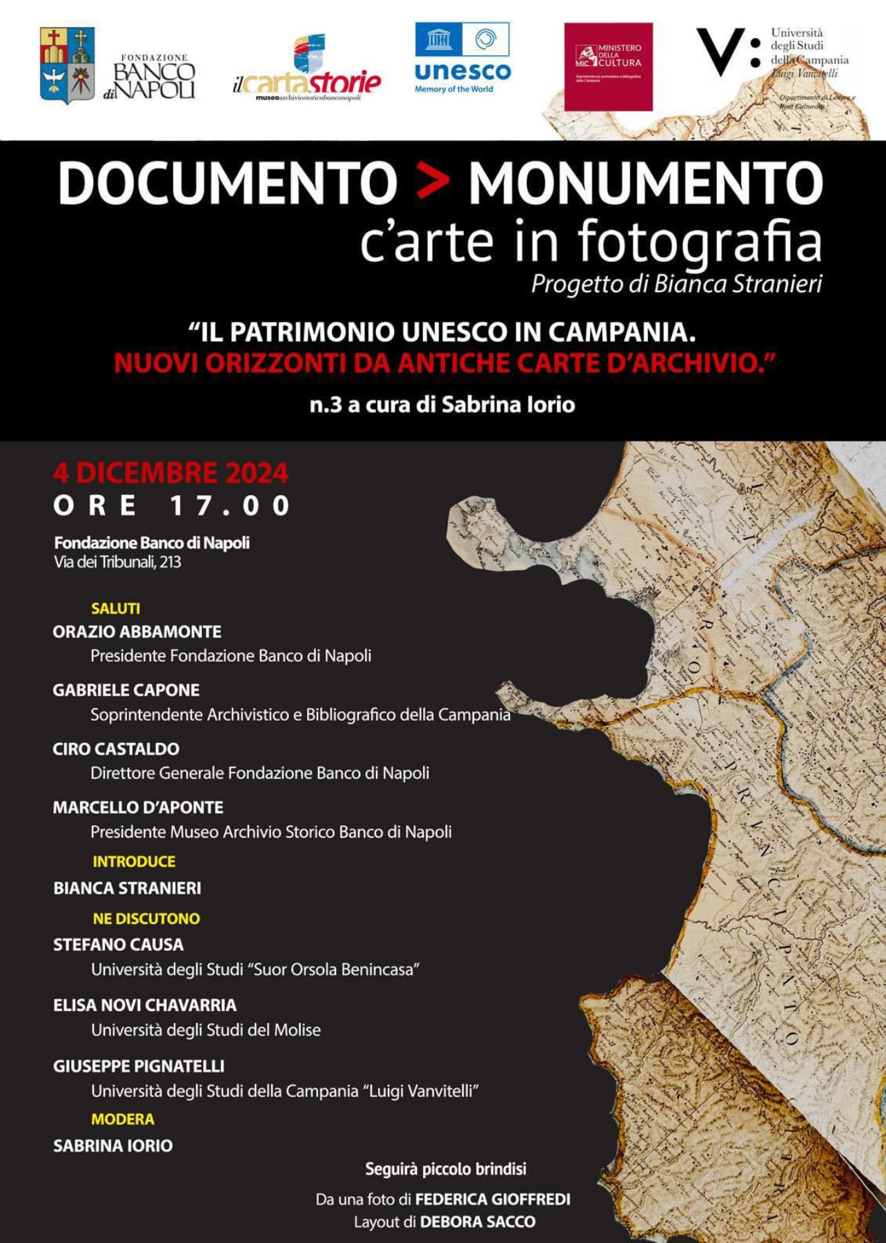 I siti UNESCO della Campania sono al centro del progetto editoriale Documento > Monumento. C’arte in fotografia, ideato e coordinato dalla ricercatrice e storica dell’arte Bianca Stranieri. Questo terzo volume della guida a percorsi storici e artistici, curata dall’architetto archivista Sabrina Iorio, con le foto di Federica Gioffredi si presenta mercoledì 4 dicembre alle 17 a Palazzo Ricca, Via dei Tribunali, 213. La collana pubblicata da Guida Editori, è sostenuta dalla Fondazione Banco di Napoli e dal Dipartimento di Lettere e Beni Culturali dell’Università della Campania Luigi Vanvitelli, con il patrocinio della Soprintendenza Archivistica e Bibliografica della Campania. Si tratta di un viaggio tra le meraviglie campane, diviso per aree secondo un concetto spaziale, che dal centro storico di Napoli s’irradia verso i resti archeologici di Pompei ed Ercolano, passa per la Reggia di Caserta e San Leucio, si sposta verso la chiesa e il monastero di Santa Sofia a Benevento, affacciandosi sulla Costiera Amalfitana, fino a giungere nel Cilento, culla del Parco e delle testimonianze antiche di Velia e Paestum e della Certosa di San Lorenzo a Padula. L’itinerario prosegue, traslocando dal piano dei beni materiali a quelli immateriali, verso il patrimonio culturale, dove trova la sua consistenza nelle pratiche tradizionali che si trasmettono di generazione in generazione, quali espressione d’identità e continuità, come l’antico mestiere dell’arte della pizza, che assicura ogni anno 200mila posti di lavoro e 12 miliardi di introiti, legandosi indissolubilmente alla ‘dieta mediterranea’. Questo percorso termina con un saluto gioioso, cui sono accorse la popolare ‘Festa dei Gigli’ di Nola dedicata a san Paolino e l’armonia unica al mondo della canzone classica napoletana. «Abbiamo dato vita a un progetto unico sotto la regìa distintiva del documento d’archivio – spiega Stranieri– primo movente di un percorso spaziale e temporale, in cui le fotografie di corredo di Federica Gioffredi concorrono a innescare meccanismi evocativi, che intrecciano il ‘vero storico’ con il ‘vero poetico’. Il motivo di tanto riscontro è da individuarsi senza dubbio anche nell’entusiasmante materia di conoscenza, laddove la Campania, regione antica e densa di bellezze naturali, ha visto il susseguirsi di diverse influenze culturali e artistiche nel corso dei millenni, tali da infonderle quell’aura di unicità che, nell’omologazione dei nostri tempi, va difesa strenuamente soprattutto attraverso il recupero e la valorizzazione storica e documentale». La curatela dei volumi, secondo una turnazione ciclica semestrale, è a opera della Stranieri e dei quattro coautori fondatori: Luigi Abetti, Gloria Guida, Sabrina Iorio, Andrea Zappulli, ciascuno dei quali propone di volta in volta un tema di ricerca che si traduce in richiamo per altri studiosi. «L’occasione – commenta Orazio Abbamonte Presidente Fondazione Banco Napoli – ben si presta a ricordare che la Fondazione ha ottenuto nel maggio 2023 l’iscrizione del Fondo Apodissario degli Antichi Banchi Pubblici Napoletani (1573-1809) dell’Archivio Storico nel Registro della Memoria del Mondo tenuto dall’UNESCO. Ciò che spinge a pensare quanto la strada intrapresa, sia quella giusta, è il fatto che le proposte di contributi si siano moltiplicate, e che gli studiosi stessi siano in buona parte rappresentati da giovani, alcuni dei quali formatisi proprio nelle sale studio del nostro Archivio, segno questo, per noi, di grande significato». La presentazione del terzo numero si apre con i saluti di Orazio Abbamonte, Marcello D’Aponte Presidente Fondazione Museo Archivio Storico, Ciro Castaldo Direttore Generale Fondazione Banco Napoli, Gabriele Capone Soprintendente archivistico e bibliografico della Campania, introduce Bianca Stranieri; intervengono: Stefano Causa Università degli Studi Suor Orsola Benincasa, Elisa Novi Chavarria Università degli Studi del Molise, Giuseppe Pignatelli Università degli Studi della Campania Luigi Vanvitelli, modera Sabrina Iorio.