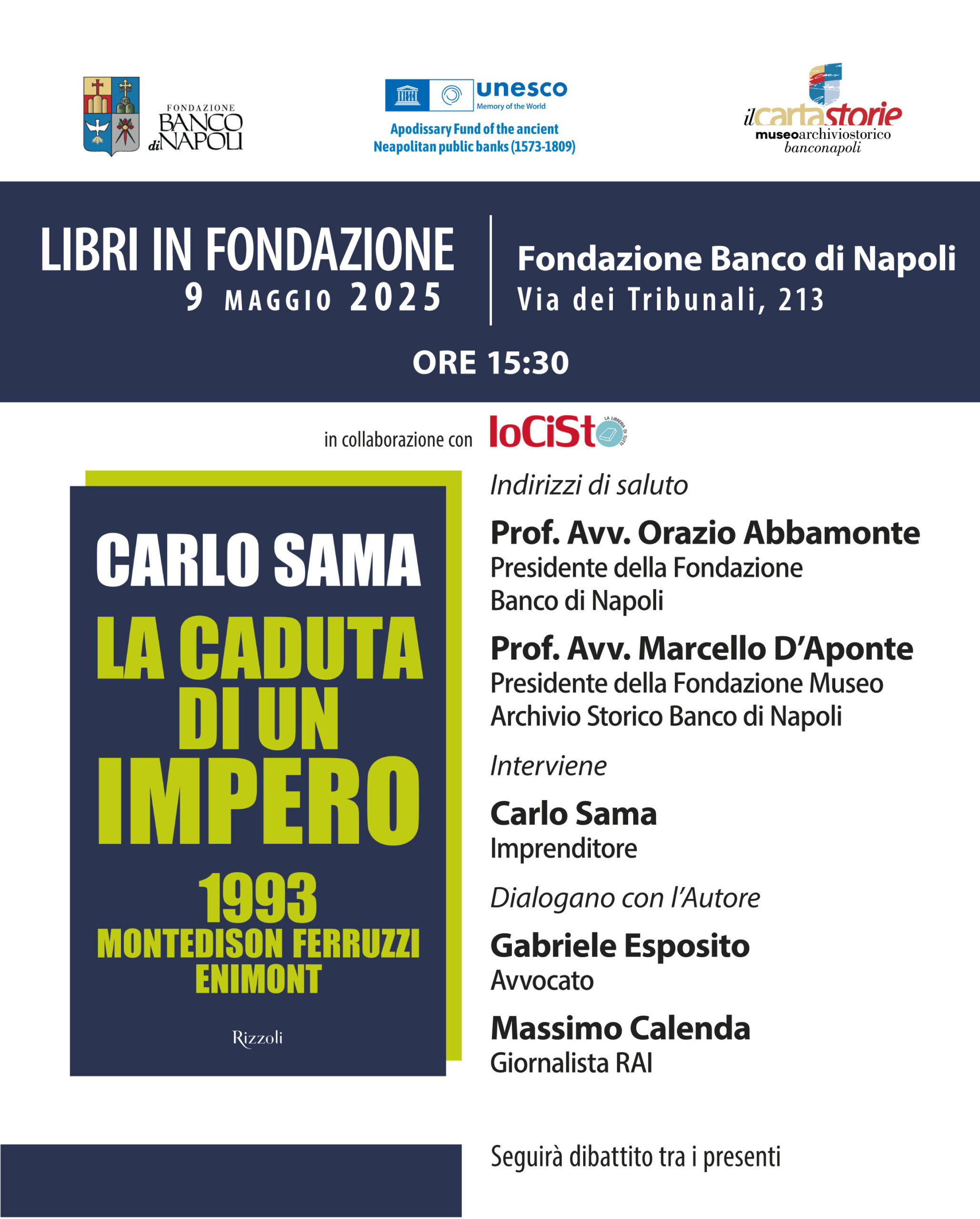 Il libro descrive le vicende familiari e finanziarie della famiglia Ferruzzi-Gardini e i motivi, sino ad ogni sconosciuti e resi pubblici da Sama, che hanno portato alla dissoluzione dell’impero agro-industriale e finanziario creato da Serafino Ferruzzi. Un libro che è l’amaro racconto di una storia che avrebbe potuto essere e non è stata, e di una nazione – l’Italia – che ha distrutto le opportunità di un futuro migliore. Questa è l’unica tappa partenopea di un tour di presentazioni, che da oltre sei mesi vede Sama ospite di enti e istituzioni. Dopo i saluti istituzionali del Prof. Orazio Abbamonte, Presidente della Fondazione Banco di Napoli e del Prof. Marcello d’Aponte, Presidente della Fondazione Museo Archivio Storico, dialogheranno con l’autore Gabriele Esposito, Vicepresidente del Consiglio dell’Ordine degli avvocati di Napoli e il giornalista Massimo Calenda.