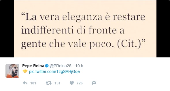 L’estremo difensore del Calcio Napoli si è affidato a Twitter, dove ha postato la frase. “La vera eleganza è restare indifferenti di fronte a gente che vale poco”. Mentre la moglie su Instagram ha pubblicato un aforisma dello scrittore tedesco Lichtenberg. “Quando i governanti perdono la vergogna, chi obbedisce perde il rispetto”.