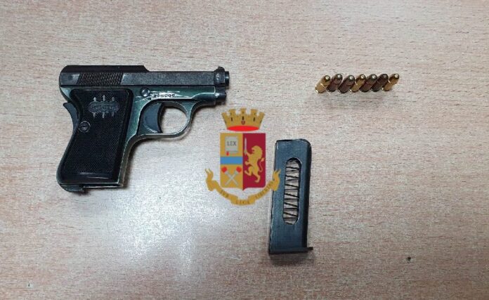 I poliziotti lo hanno raggiunto e bloccato trovandolo in possesso di una pistola Beretta con matricola abrasa completa di caricatore con 7 cartucce di cui una in canna.