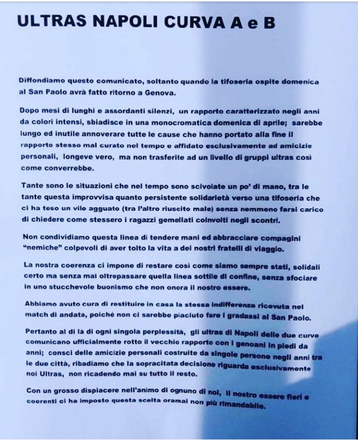 “Al di là di ogni singolo perplessità – conclude il comunicato-, gli ultras di Napoli delle due curve comunicano ufficialmente rotto il vecchio rapporto con i genoani in piedi da anni. Consci delle amicizie personali costruite da singole persone negli anni tra le due città, ribadiamo che la sopracitata decisione riguarda esclusivamente noi Ultras, non ricadendo mai su tutto il resto. Con un grosso dispiacere nell’animo di ognuno di noi, il nostro essere fieri e coerenti ci ha imposto questa scelta oramai non più rimandabile”.
